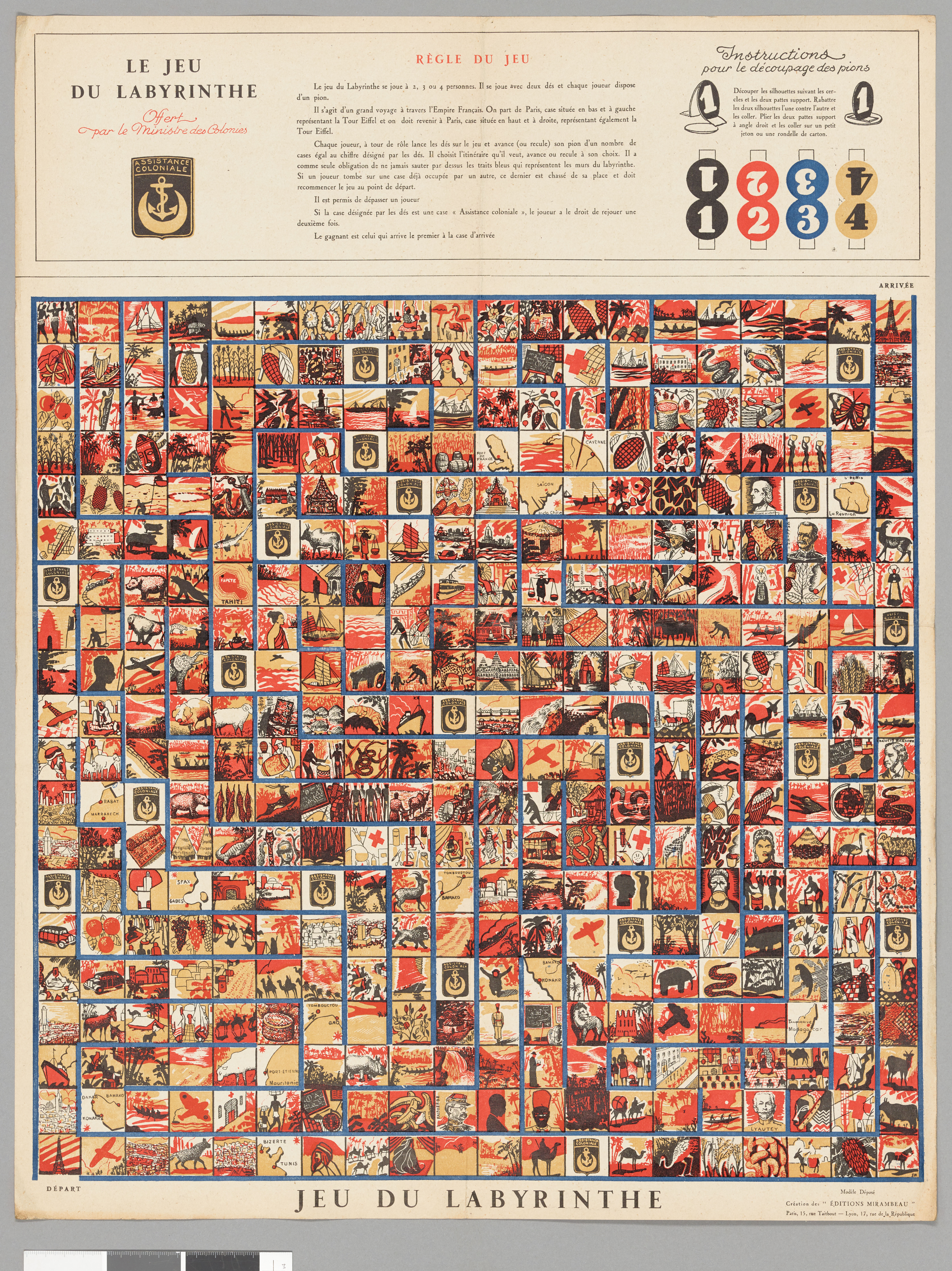 Le « Jeu du labyrinthe », conçu par le Service de l’assistance coloniale, en constitue un témoignage aussi rare que saisissant. Ce jeu de plateau, dont les règles s’apparentent à celles du Jeu de l’Oie, utilise le divertissement comme moyen d’appropriation de l’espace colonial par la jeunesse. La richesse de son iconographie, en termes de représentations des territoires, des populations ou des symboles de la colonisation, témoigne d’une volonté mêlant politique et pédagogie au service d’une idéologie impérialiste.